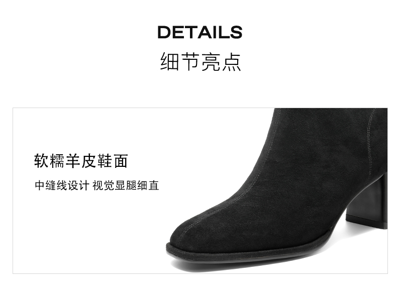 | 筒高数值:12CM | 性别:女子 | 靴筒筒面材质:羊皮革 | 里料材质:织物猪皮革 | 制鞋工艺:车线胶粘 |