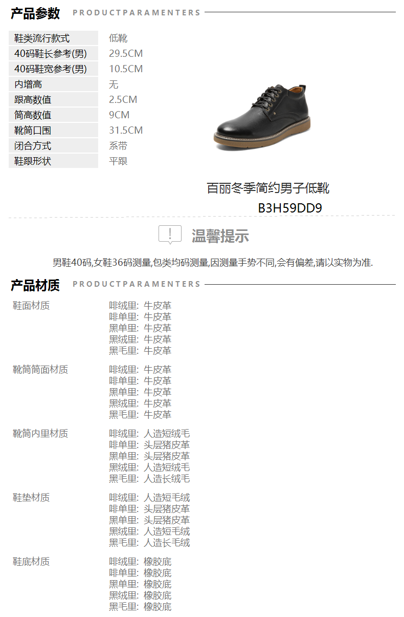 | 风格:简约 | 色系:黑色 | 跟高数值:2.5CM | 40码鞋宽参考(男):10.5CM | 筒高数值:9CM |