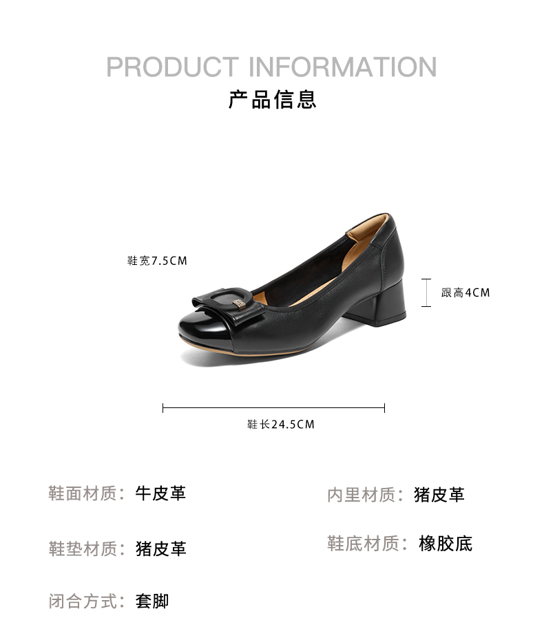 | 参考标准尺码:36码 | 跟高数值:4CM | 性别:女子 | 里料材质:猪皮革 | 制鞋工艺:车线胶粘 |