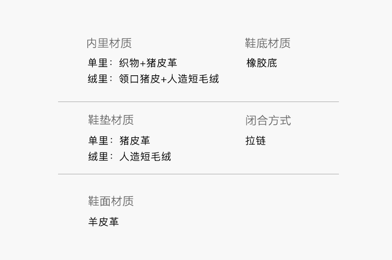 | 款式季节:冬季 | 前掌高度:无 | 皮质特征:羊皮革 | 防水台高度:无 |