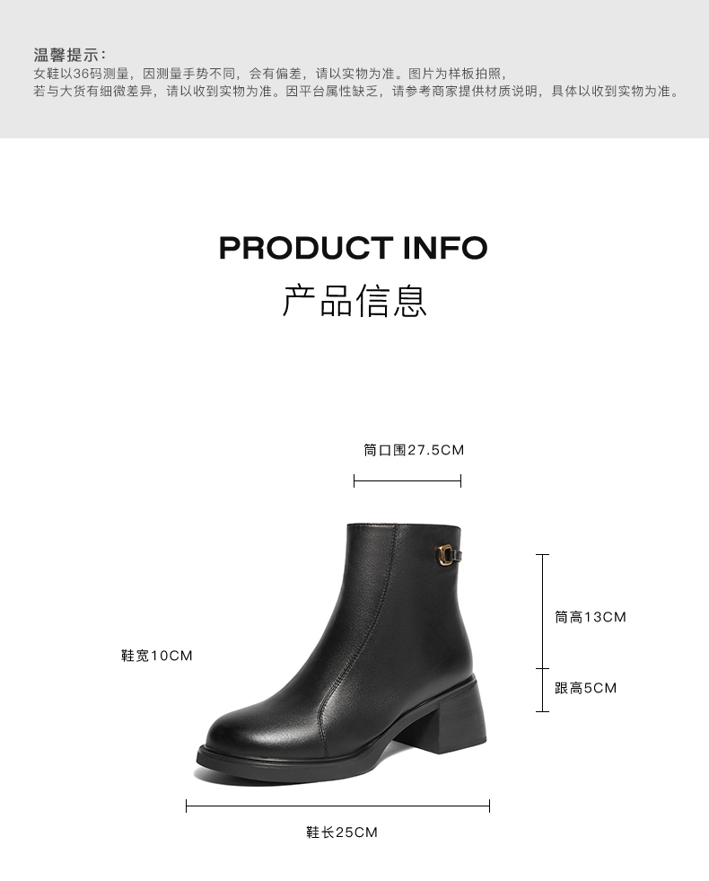 | 参考鞋宽(女):10CM | 风格:时尚休闲 | 色系:黑色 | 跟高数值:5CM | 筒高数值:13CM |
