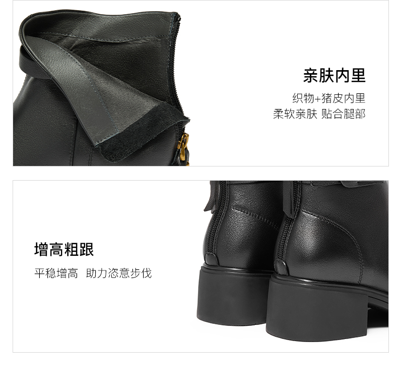 | 筒高数值:12CM | 性别:女子 | 靴筒筒面材质:羊皮革 | 里料材质:织物面料猪皮革 | 制鞋工艺:车线胶粘 |