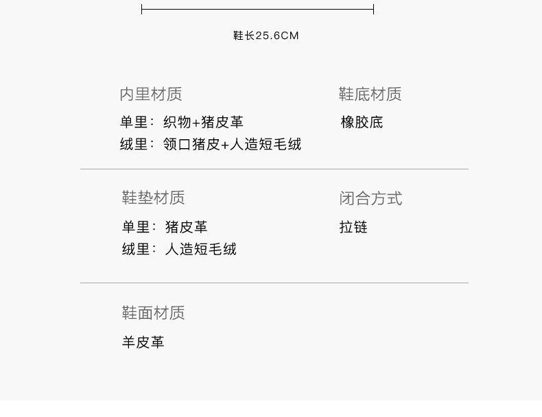 | 靴筒筒面材质:羊皮革 | 里料材质:猪皮革人造短毛绒 | 制鞋工艺:车线胶粘 | 鞋垫材质:人造短毛绒 | 款式季节:冬季 |