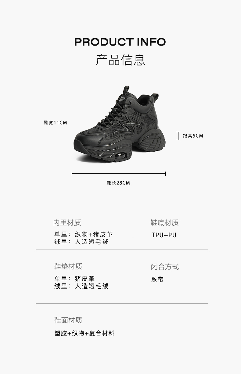 | 风格分类:高帮老爹 | 上市时间:2024年冬季 | 生产/经销/进口厂家:百丽电子商务(上海)有限公司 | 鞋类流行款式:老爹鞋 | 鞋头款式:圆头 |