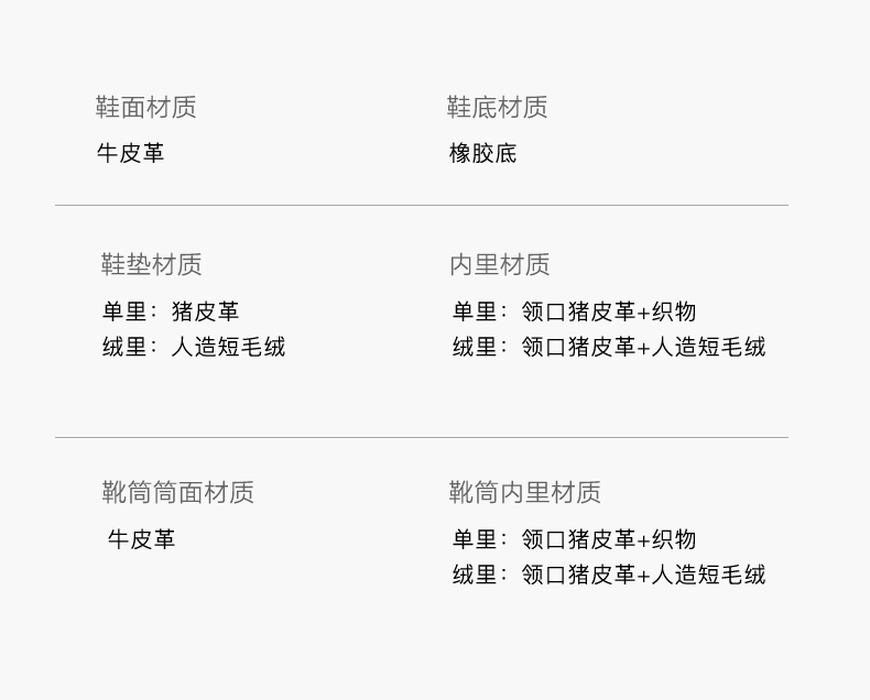 | 功能科技:耐磨 | 鞋底材质:橡胶底 | 靴筒内里材质:织物猪皮革 | 内增高:无 | 鞋面材质:牛皮革 |