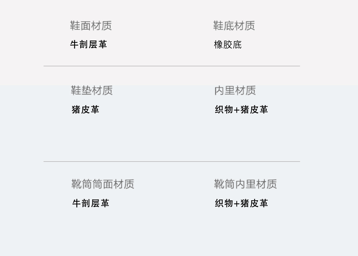 | 鞋底材质:橡胶底 | 靴筒内里材质:织物猪皮革 | 内增高:无 | 鞋面材质:牛剖层革 | 闭合方式:套筒 |