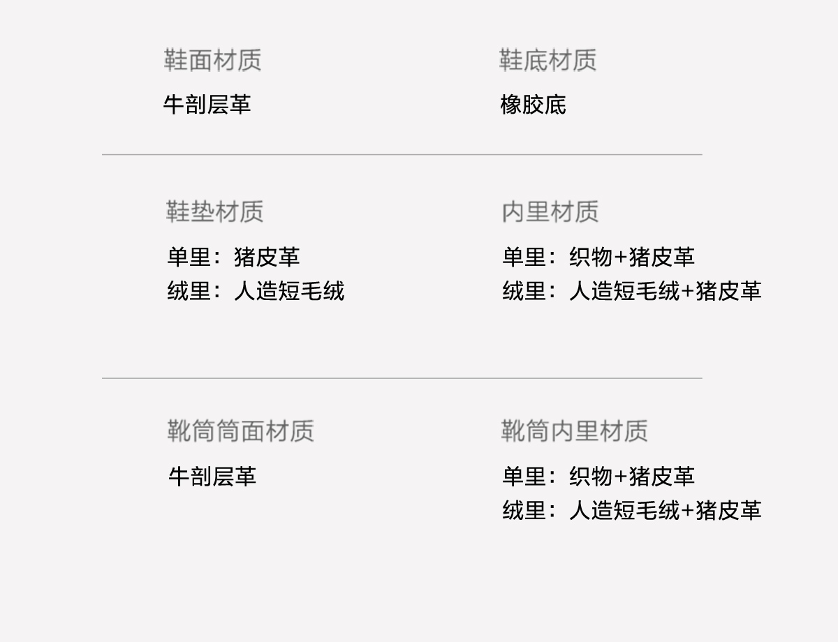 | 鞋底材质:橡胶底 | 靴筒内里材质:人造短毛绒 | 内增高:无 | 鞋面材质:牛剖层革 | 闭合方式:套筒 |