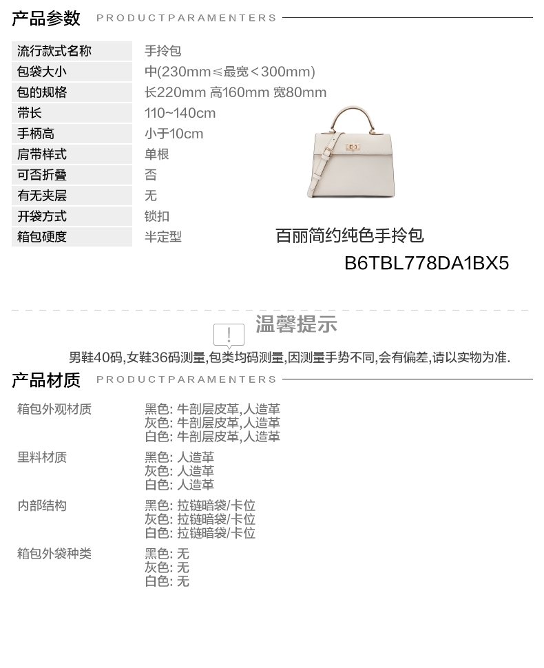 | 适用场景:通勤 | 开袋方式:锁扣 | 性别:女 | 手柄高:小于10cm | 里料材质:人造革 |