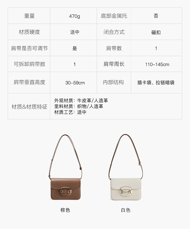| 适用场景:通勤 | 开袋方式:磁扣 | 性别:女子 | 手柄高:无 | 里料材质:织物/人造革 |