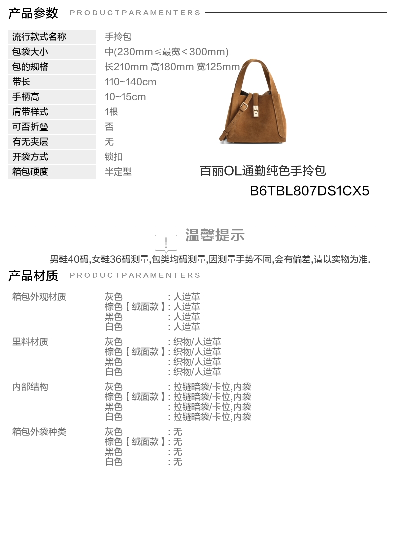 | 适用场景:通勤 | 开袋方式:锁扣 | 性别:女 | 手柄高:10~15cm | 里料材质:织物/人造革 |