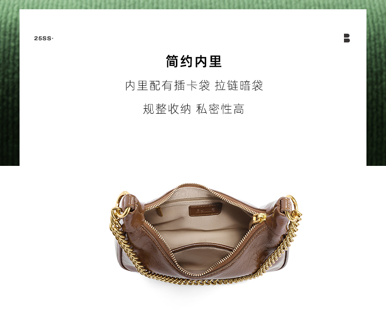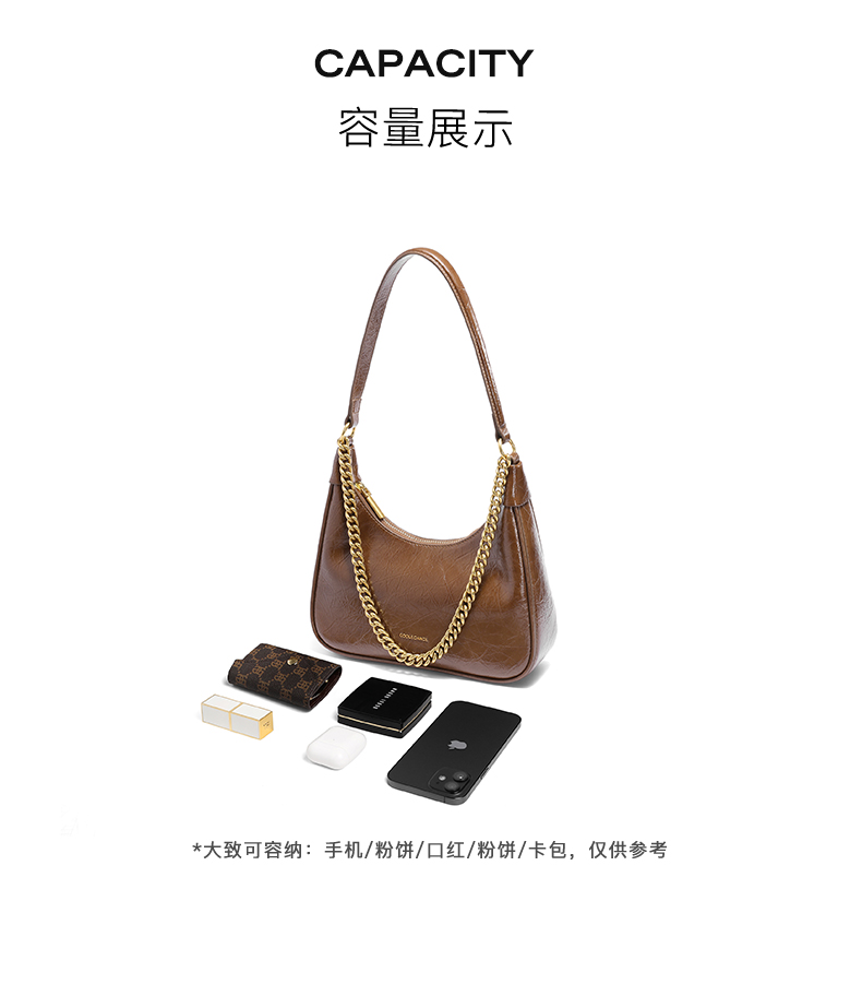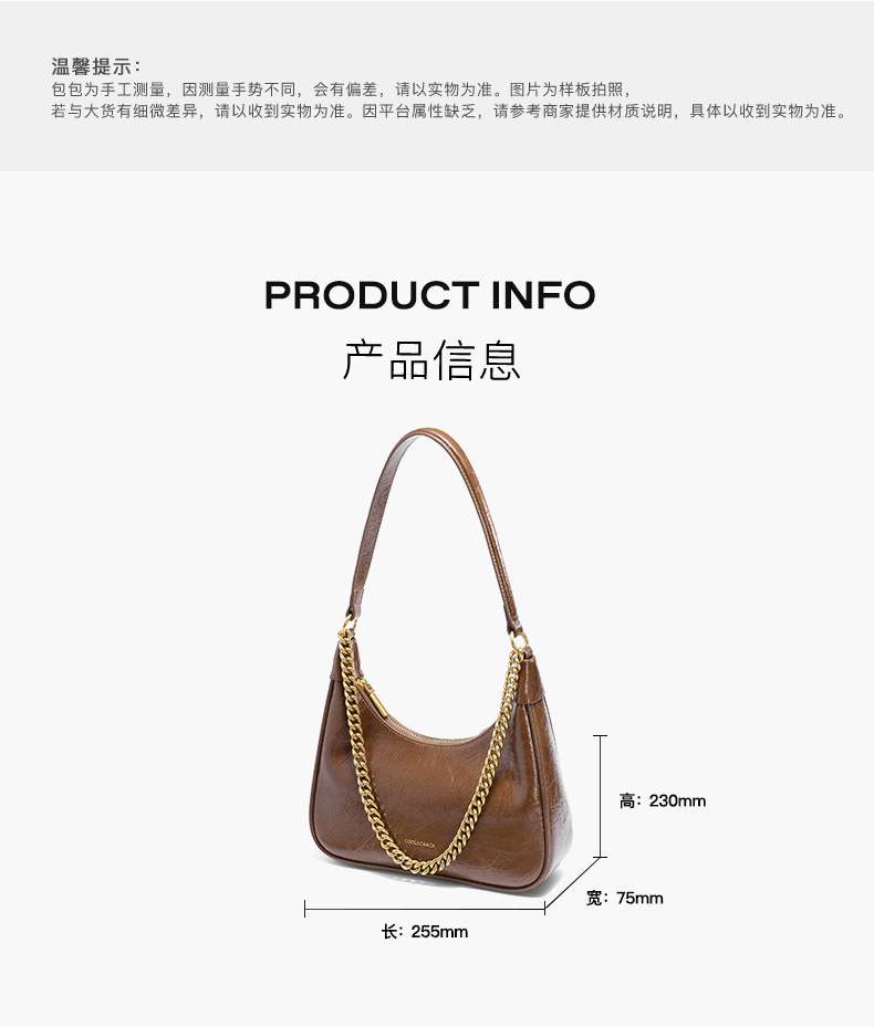 | 包的规格:W255*H230*D75mm | 内部结构:拉链暗袋/卡位 | 背带方式:单肩/斜挎 | 风格:OL通勤 | 色系:棕色 |