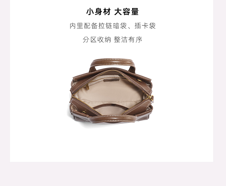 | 包的规格:W210*H135*D95mm | 内部结构:拉链暗袋/卡位 | 背带方式:单肩/斜挎 | 风格:OL通勤 | 色系:棕色 |
