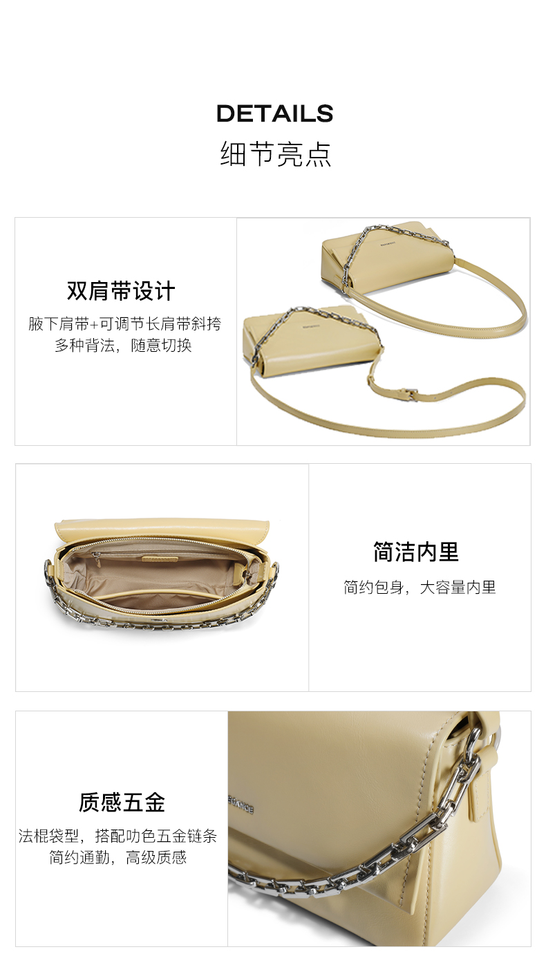 | 包的规格:W230*H130*D75mm | 内部结构:卡袋拉链暗袋 | 背带方式:单肩/斜挎 | 风格:简约 | 色系:黄色 |