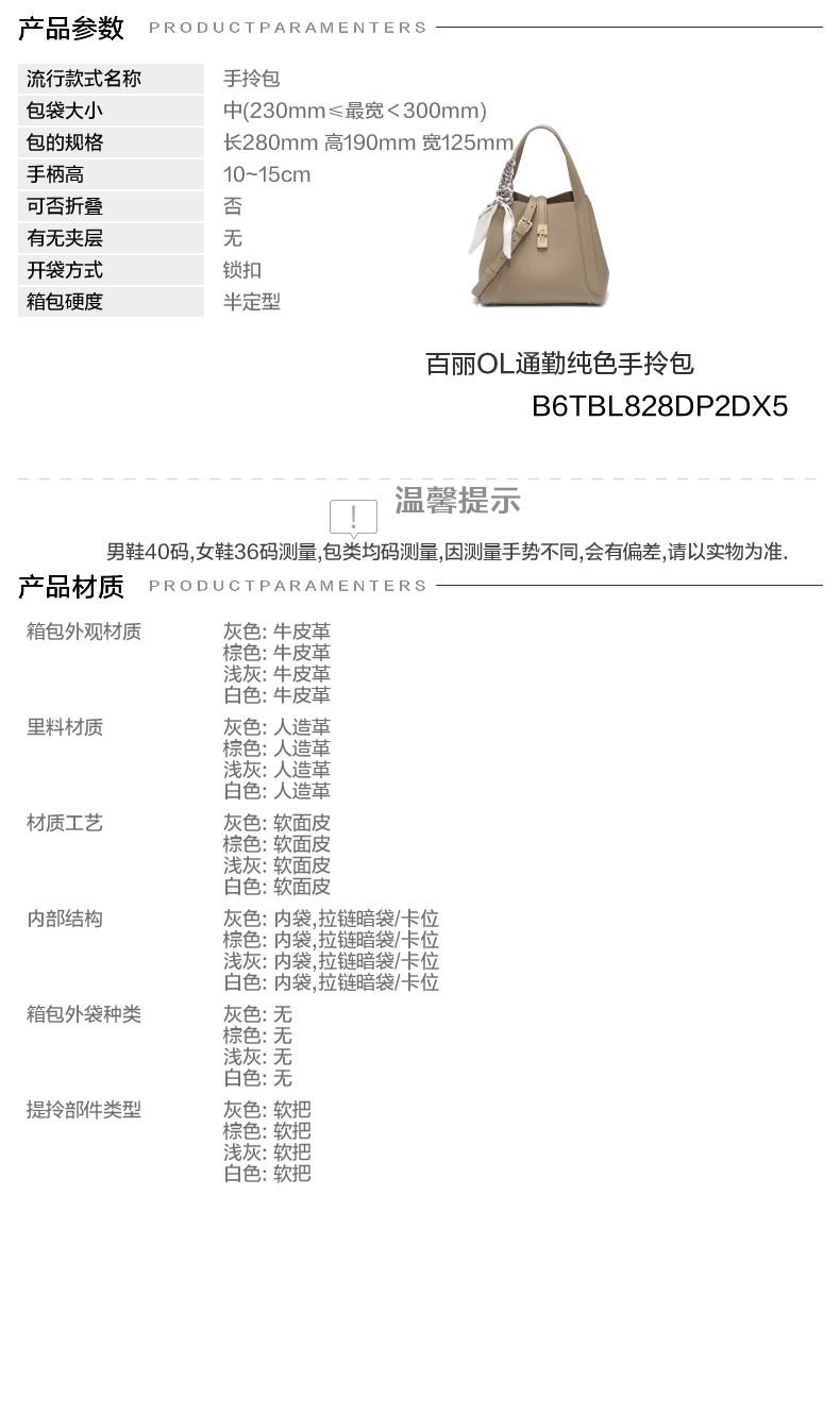 | 开袋方式:锁扣 | 性别:女子 | 是否防水:否 | 里料材质:人造革 | 手柄高:10~15cm |