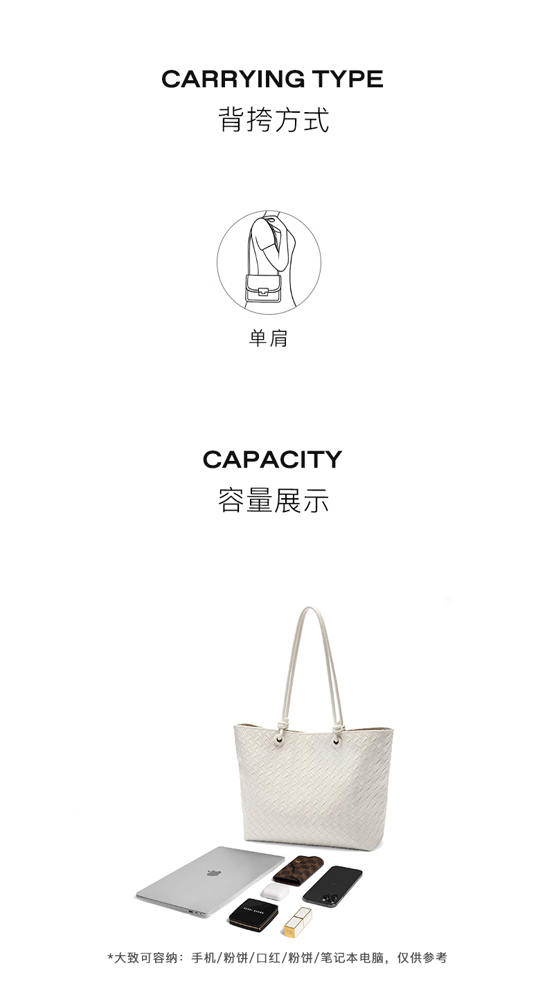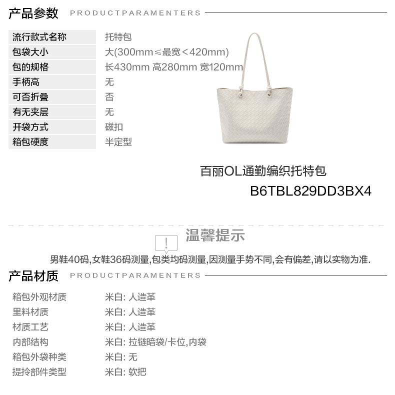 | 包的规格:W430*H280*D120mm | 内部结构:内袋拉链暗袋/卡位 | 背带方式:单肩 | 风格:OL通勤 | 色系:白色 |