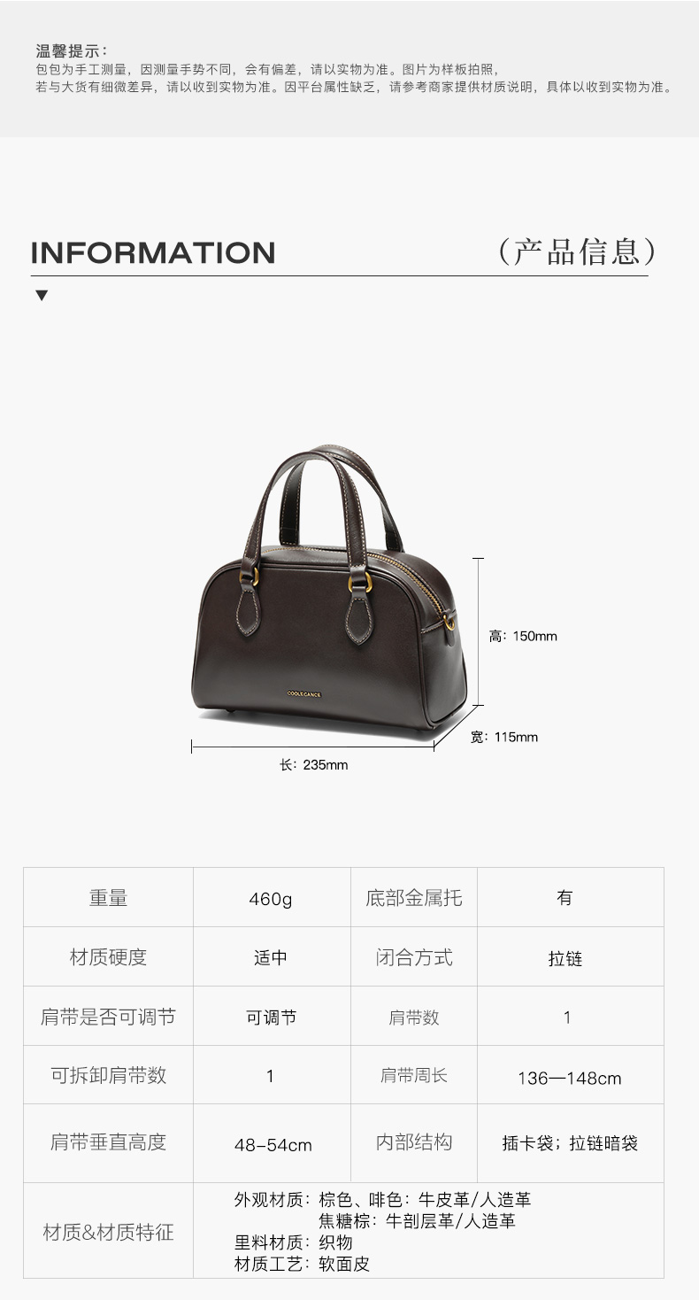 | 肩带样式:1根 | 手柄:有 | 流行元素:纯色 | 可否折叠:否 | 包的规格:W235*H150*D115mm |