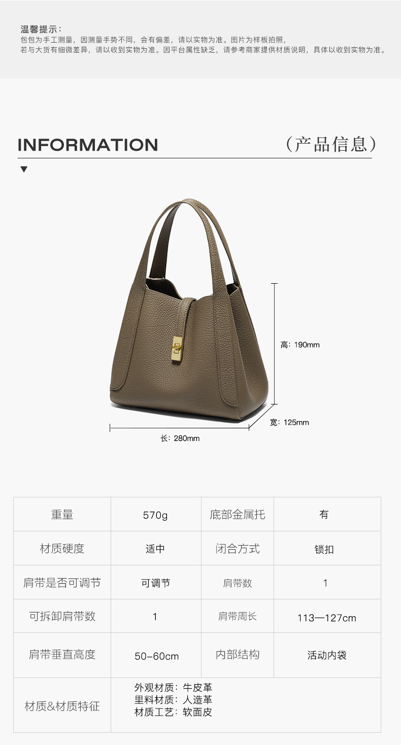 | 肩带样式:1根 | 手柄:有 | 流行元素:纯色 | 可否折叠:否 | 包的规格:W280*H190*D125mm |
