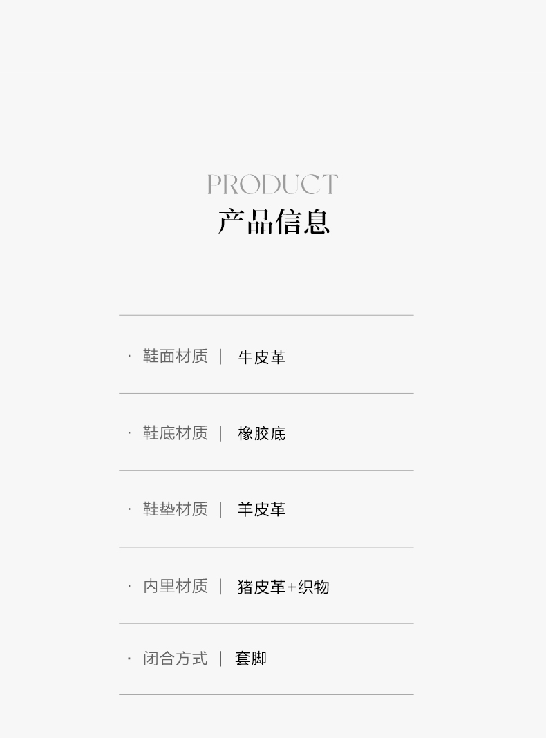 | 前掌高度:无 | 皮质特征:牛皮革 | 防水台高度:无 | 销售季:2024年春季 |