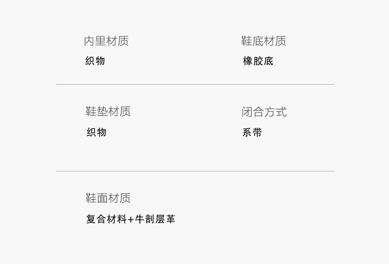 | 鞋帮:低帮 | 功能科技:耐磨 | 鞋底材质:橡胶底 | 内增高:无 | 鞋面材质:牛剖层革复合材料 |