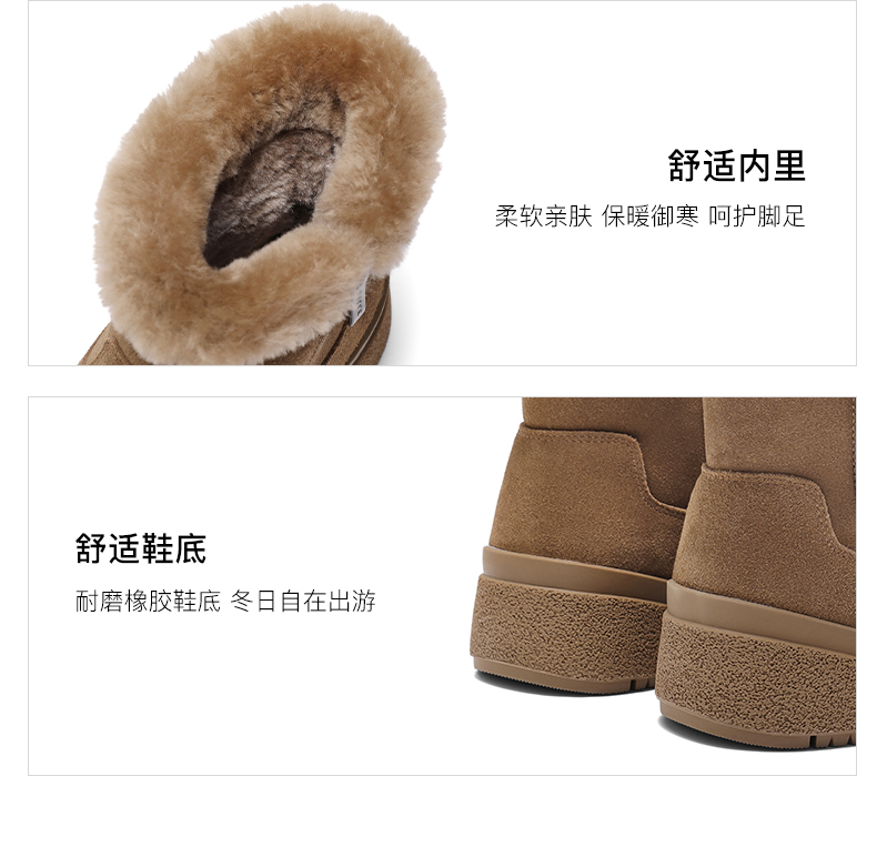 | 筒高数值:12CM | 性别:女子 | 靴筒筒面材质:羊毛牛剖层皮革 | 里料材质:人造毛绒羊毛 | 制鞋工艺:车线胶粘 |