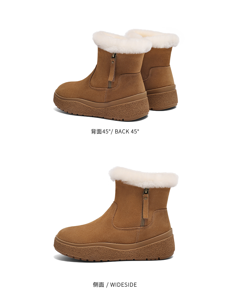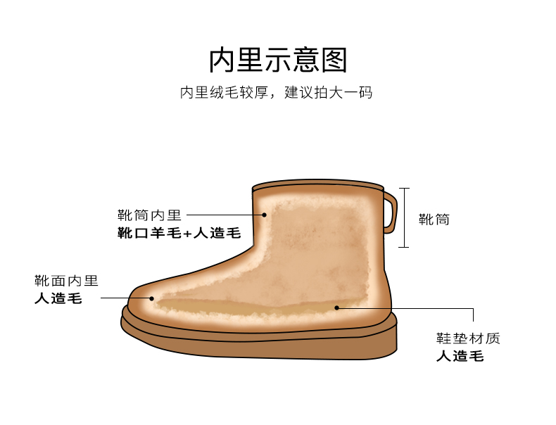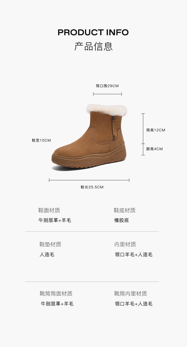 | 筒高数值:12CM | 性别:女子 | 靴筒筒面材质:牛剖层皮革羊毛 | 里料材质:羊毛人造毛绒 | 制鞋工艺:车线胶粘 |