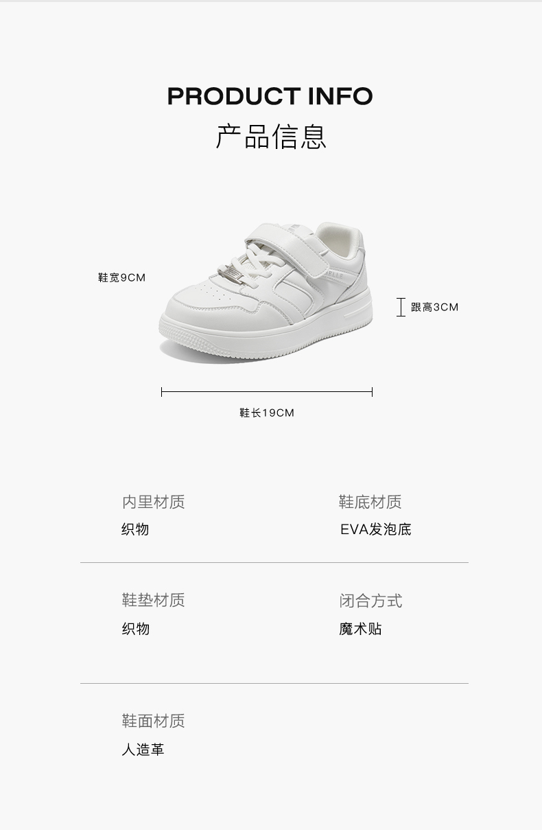 | 参考鞋宽(童):9CM | 鞋底材质:EVA | 鞋面材质:人造革 | 闭合方式:系带 | 参考鞋长(童):19CM |