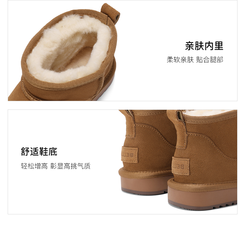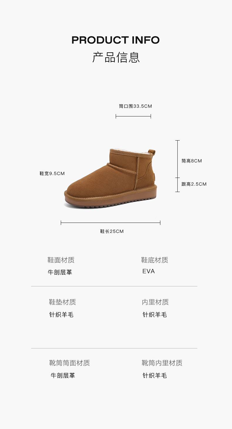 | 筒高数值:8CM | 性别:女子 | 靴筒筒面材质:牛剖层皮革 | 里料材质:针织羊毛 | 制鞋工艺:车线胶粘 |