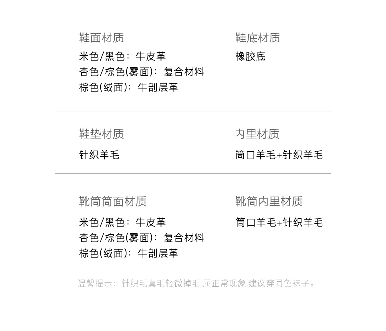 | 筒高数值:11CM | 性别:女子 | 靴筒筒面材质:牛皮革 | 里料材质:针织羊毛羊毛 | 制鞋工艺:车线胶粘 |