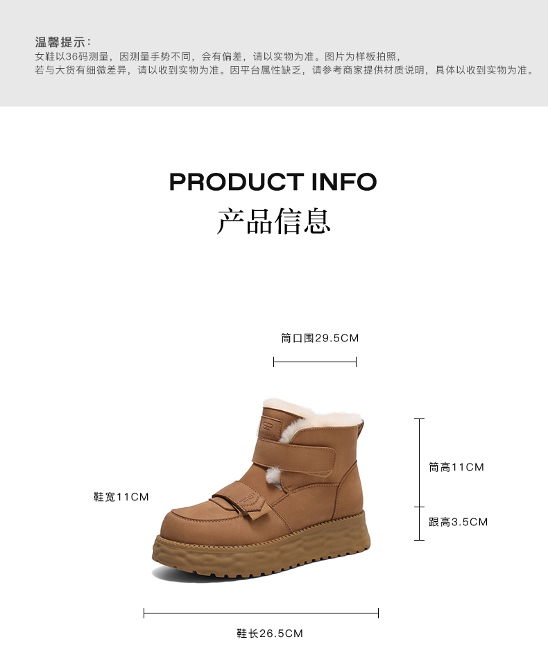 | 筒高数值:11CM | 性别:女子 | 靴筒筒面材质:牛皮革 | 里料材质:针织羊毛真毛绒 | 制鞋工艺:车线胶粘 |