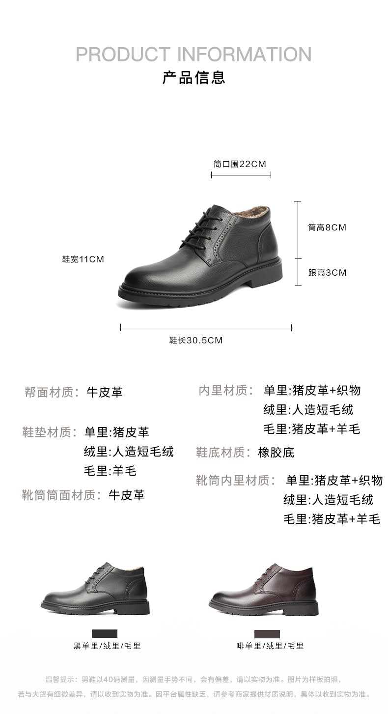 | 40码鞋长参考(男):30.5CM | 鞋底材质:橡胶底 | 靴筒内里材质:人造短毛绒 | 内增高:无 | 鞋面材质:牛皮革 |