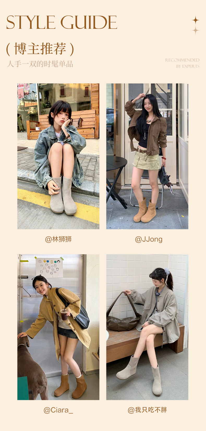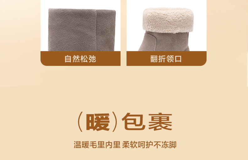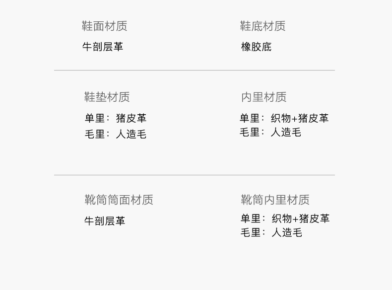 | 功能科技:耐磨保暖 | 鞋底材质:橡胶底 | 靴筒内里材质:人造毛绒 | 内增高:2CM | 鞋面材质:牛剖层革 |