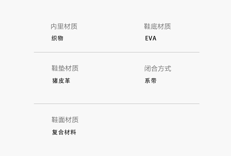 | 鞋帮:低帮 | 功能科技:耐磨 | 鞋底材质:EVA | 内增高:无 | 鞋面材质:复合材料 |
