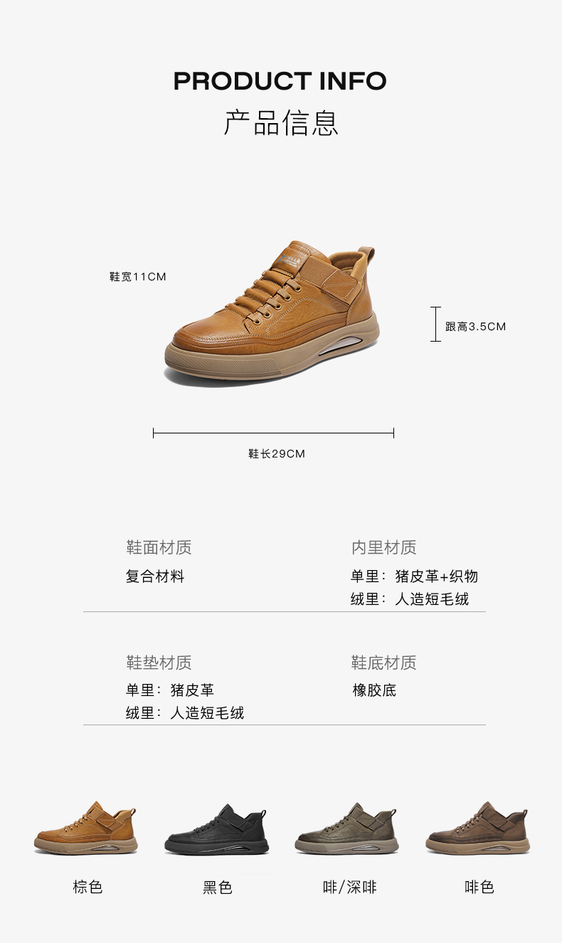 | 风格:休闲 | 色系:咖啡色 | 跟高数值:3CM | 40码鞋宽参考(男):11CM | 性别:男子 |