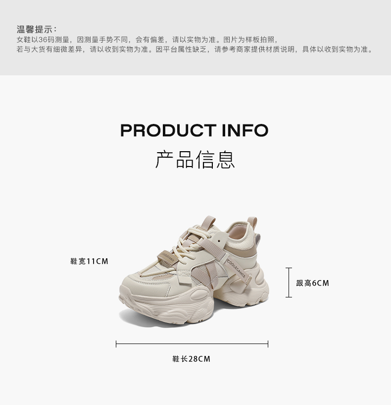 | 执行标准:舒适运动鞋Q/LR002-2023若与实物发生差异,请以实物标签为准 | 跟高范围:高跟鞋(6-8CM) | 鞋面图案:拼色 | 鞋跟形状:厚底 | 厂家地址:上海市虹口区中山北二路1705号838室 |