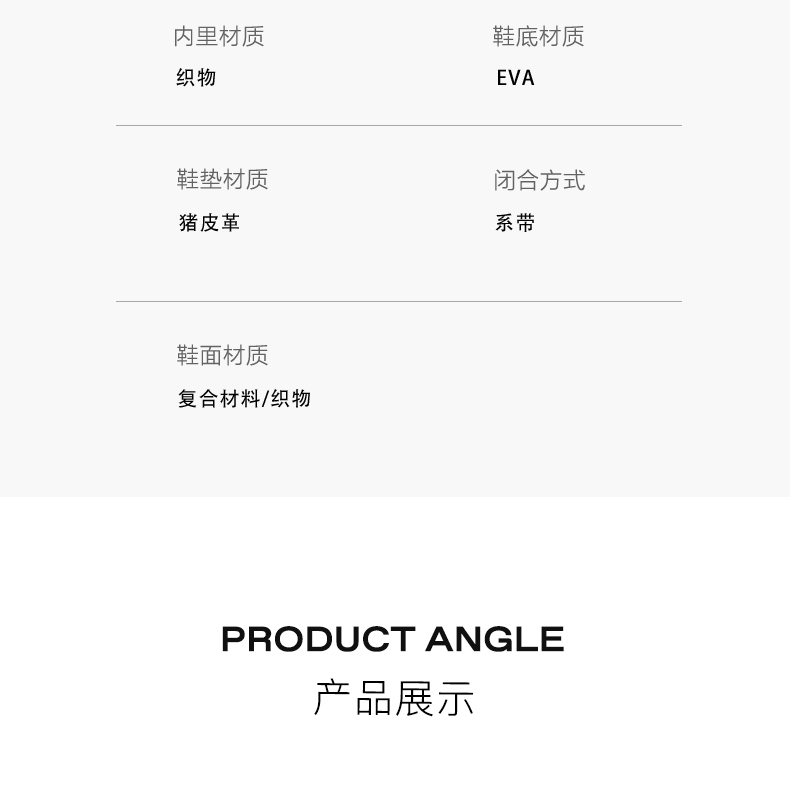 | 鞋帮:低帮 | 功能科技:无 | 鞋底材质:EVA | 内增高:无 | 鞋面材质:织物面料复合材料 |