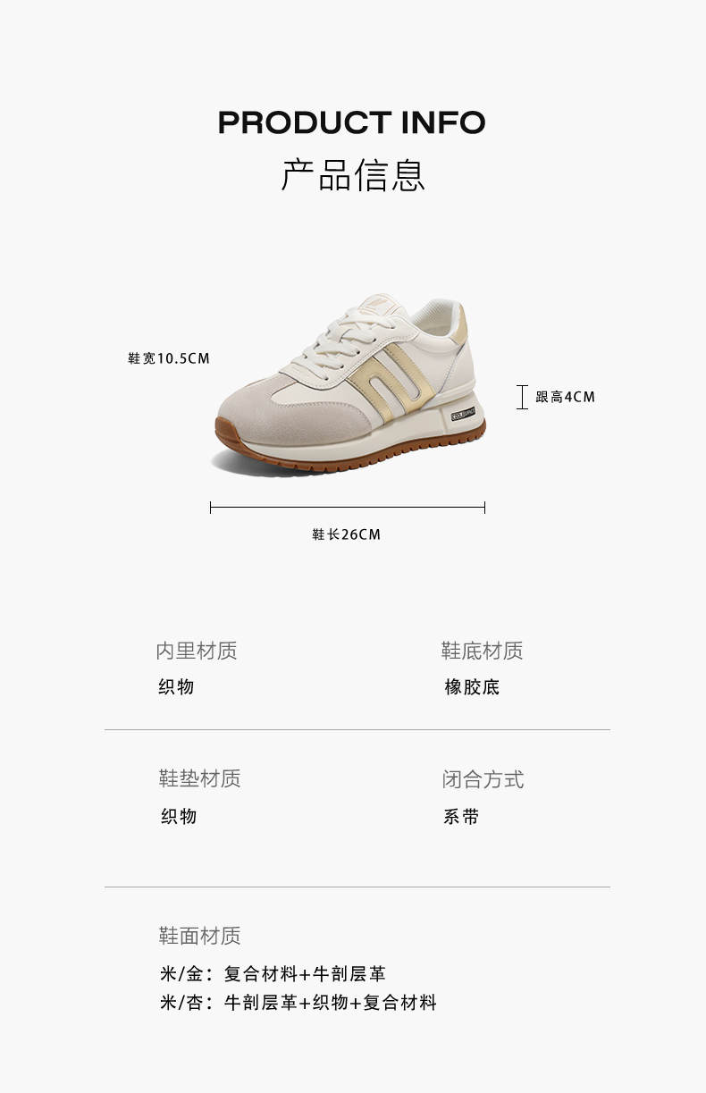 | 鞋帮:低帮 | 鞋底材质:橡胶底 | 内增高:1.5CM | 鞋面材质:复合材料织物面料牛剖层革 | 闭合方式:系带 |