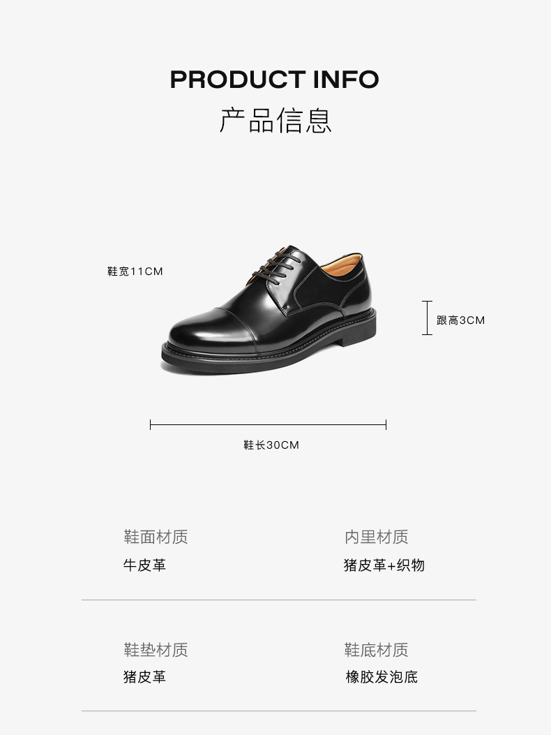 | 风格:商务 | 色系:黑色 | 跟高数值:3CM | 40码鞋宽参考(男):11CM | 性别:男子 |