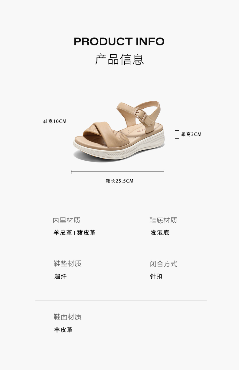 | 渠道划分:电商专销 | 前掌高度:无 | 皮质特征:羊皮革 | 防水台高度:无 | 销售季:2025年夏季 |