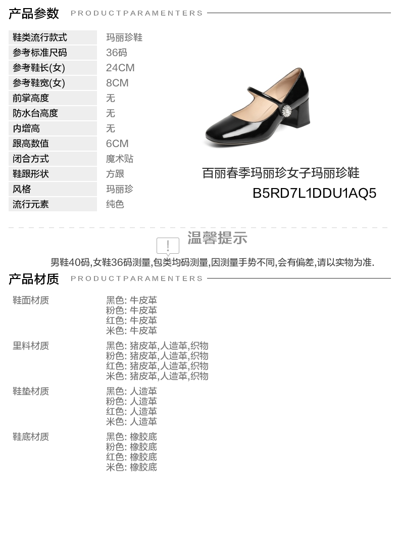 | 上市时间:2025年春季 | 生产/经销/进口厂家:百丽电子商务(上海)有限公司 | 鞋类流行款式:玛丽珍鞋 | 鞋头款式:方头 | 执行标准:舒适上班鞋Q/LR001-2023若与实物发生差异,请以实物标签为准 |