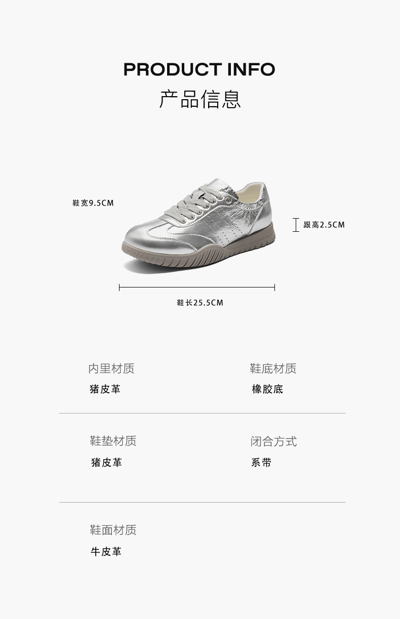 | 色系:银色 | 参考标准尺码:36码 | 跟高数值:2.5CM | 性别:女子 | 里料材质:猪皮革 |