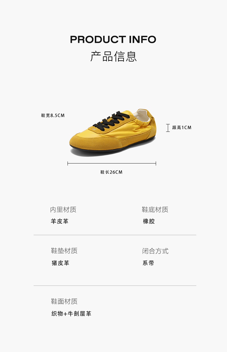 | 色系:黄色 | 跟高数值:0.5CM | 性别:女子 | 里料材质:羊皮革 | 制鞋工艺:车线胶粘 |