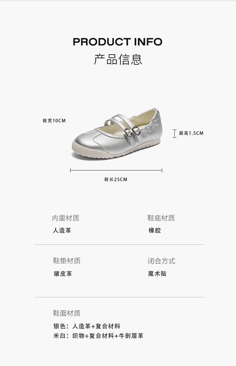 | 风格:休闲 | 跟高数值:1.5CM | 色系:银色 | 配跟:无 | 性别:女子 |