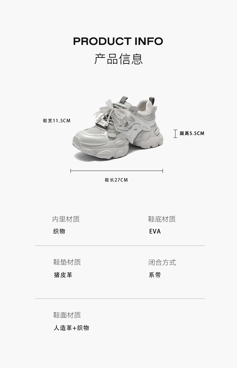 | 鞋面图案:拼色 | 鞋跟形状:厚底 | 参考鞋长(女):27CM | 流行元素:水钻 | 参考鞋宽(女):11.5CM |