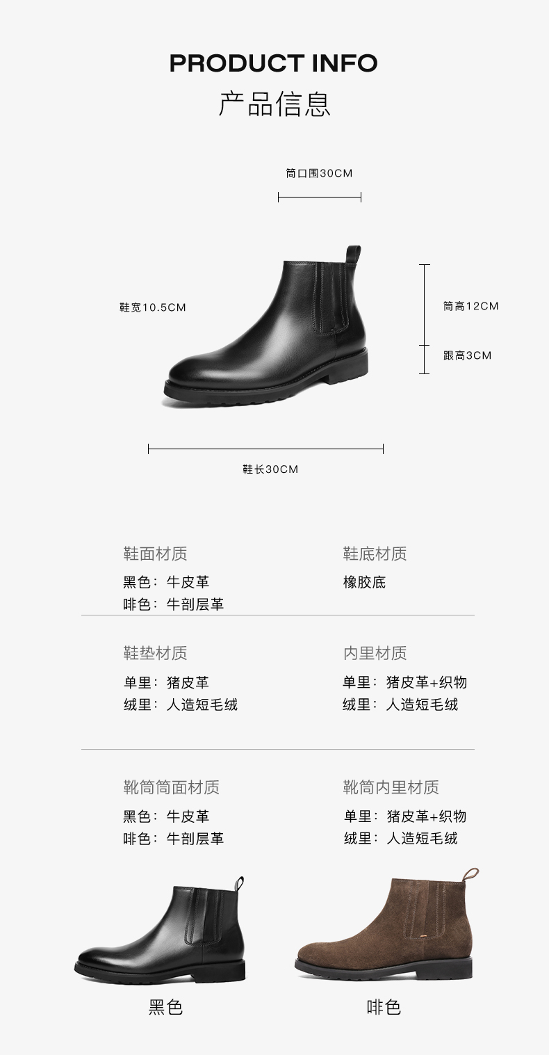 | 风格:休闲 | 色系:黑色 | 跟高数值:3CM | 40码鞋宽参考(男):10.5CM | 筒高数值:12CM |