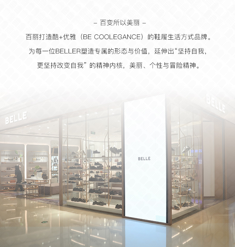 BeLLE(百丽),百变所以美丽。主张多变多元的新生代态度,不断融合潮流趋势,拥抱不同的生活体验与生活经历。将女性的百变魅力注入到鞋履设计中,让女人在不同的人生阶段,不同的场合,不同的潮流趋势下,尽显自己自信的一面。致力于为现代都市女性提供充满自由的行走体验。