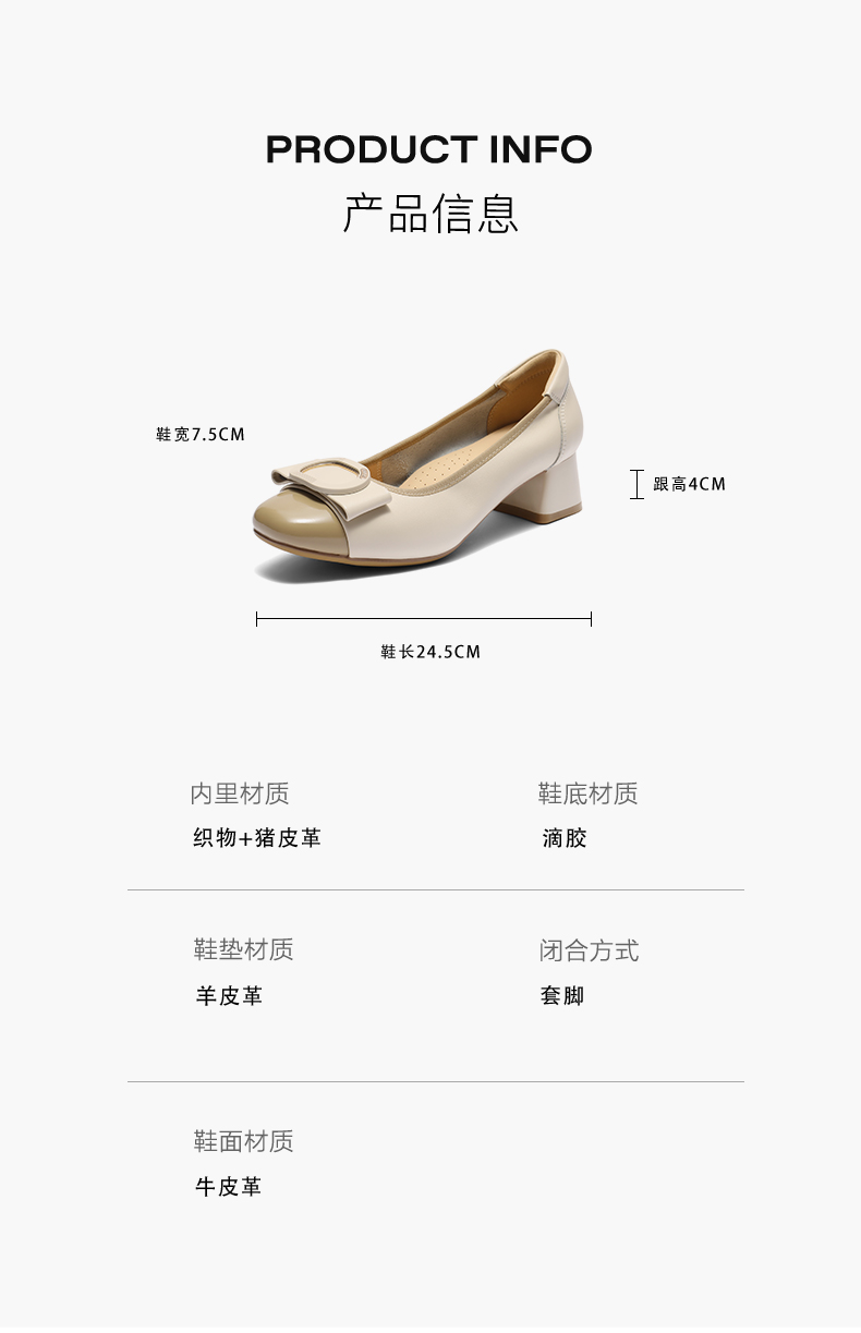 | 色系:米白 | 跟高数值:4CM | 性别:女子 | 里料材质:猪皮革织物 | 制鞋工艺:车线胶粘 |
