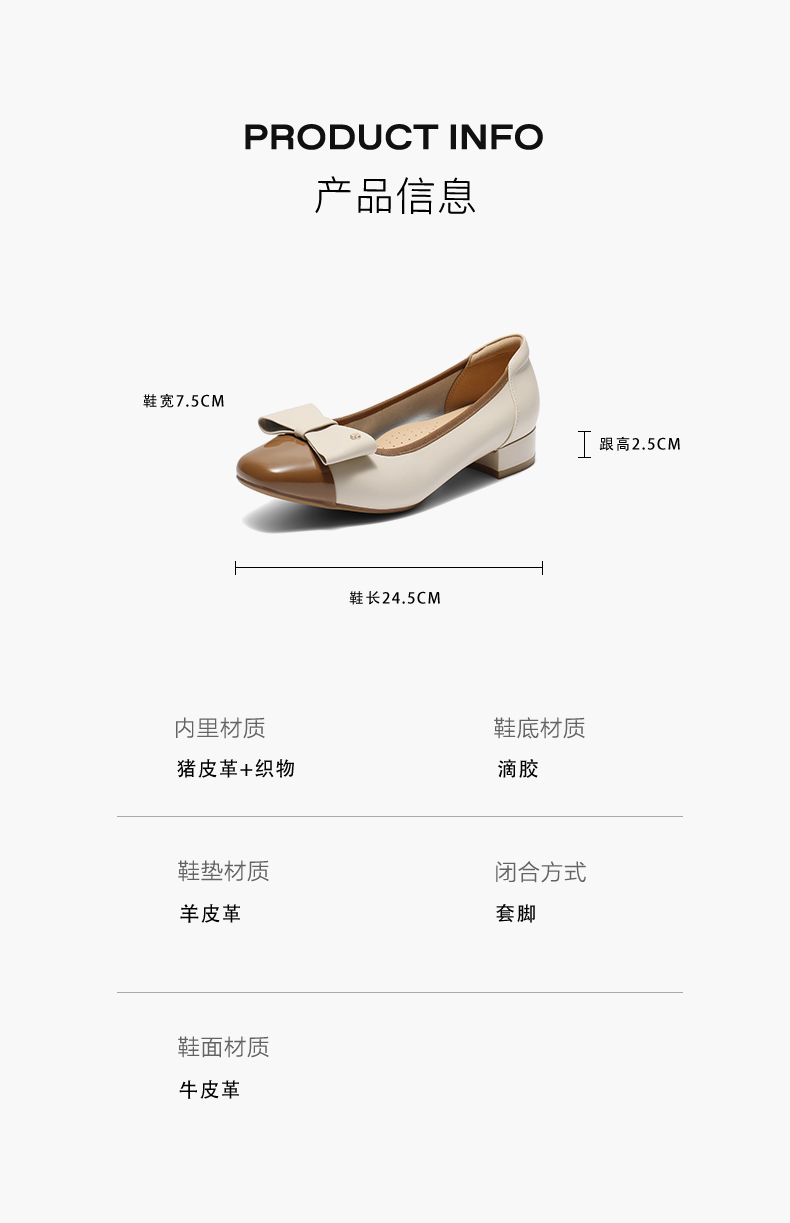 | 色系:杏色 | 跟高数值:2.5CM | 性别:女子 | 里料材质:织物猪皮革 | 制鞋工艺:车线胶粘 |
