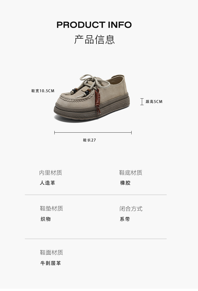 | 鞋帮:低帮 | 鞋底材质:橡胶底 | 内增高:无 | 鞋面材质:牛剖层革 | 闭合方式:系带 |