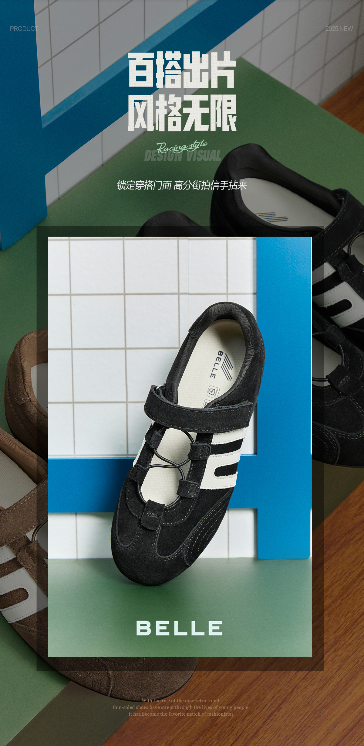 BeLLE(百丽),百变所以美丽。主张多变多元的新生代态度,不断融合潮流趋势,拥抱不同的生活体验与生活经历。将女性的百变魅力注入到鞋履设计中,让女人在不同的人生阶段,不同的场合,不同的潮流趋势下,尽显自己自信的一面。致力于为现代都市女性提供充满自由的行走体验。