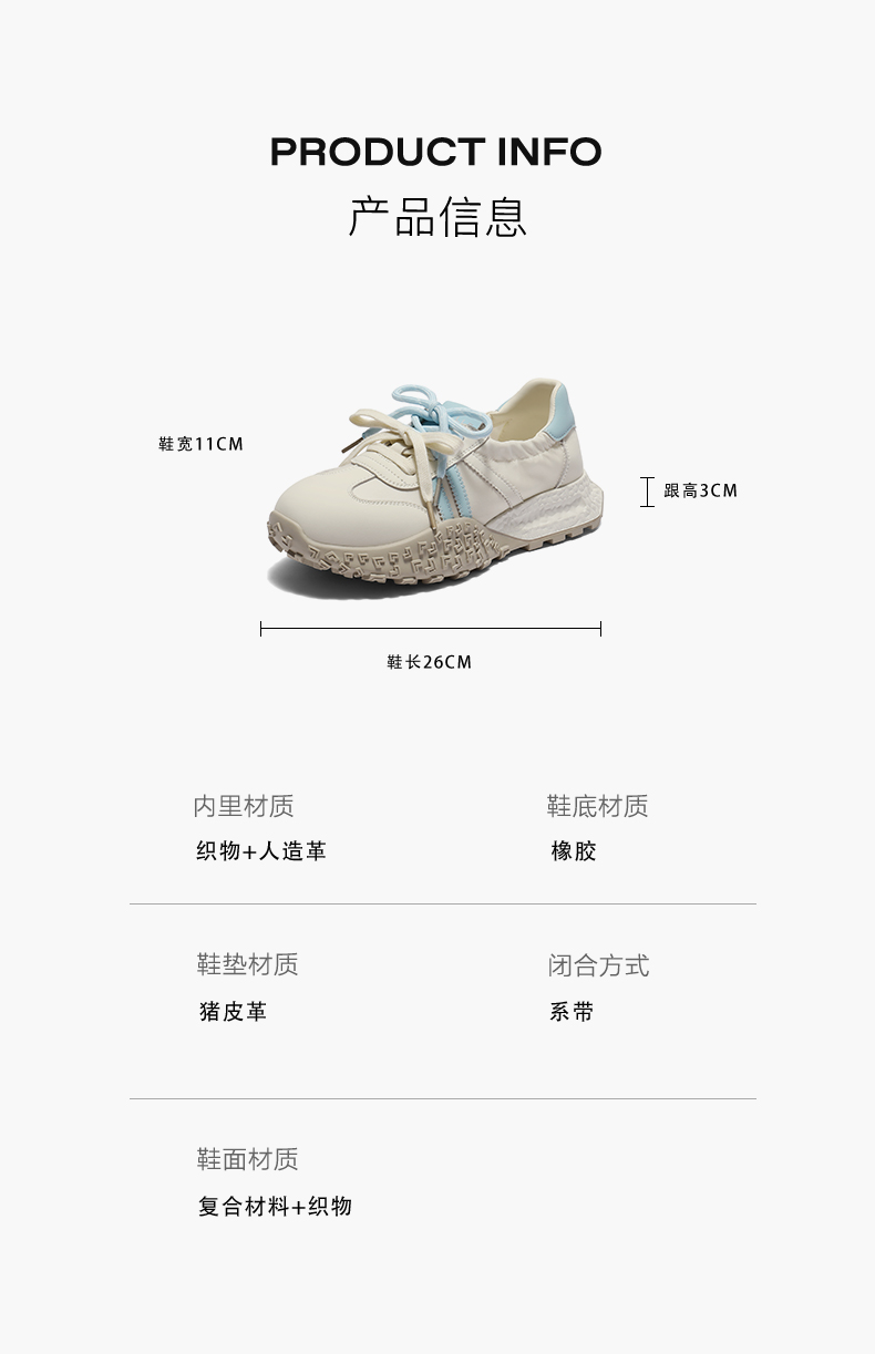 | 鞋帮:低帮 | 鞋底材质:橡胶底 | 内增高:无 | 鞋面材质:织物复合材料 | 闭合方式:系带 |